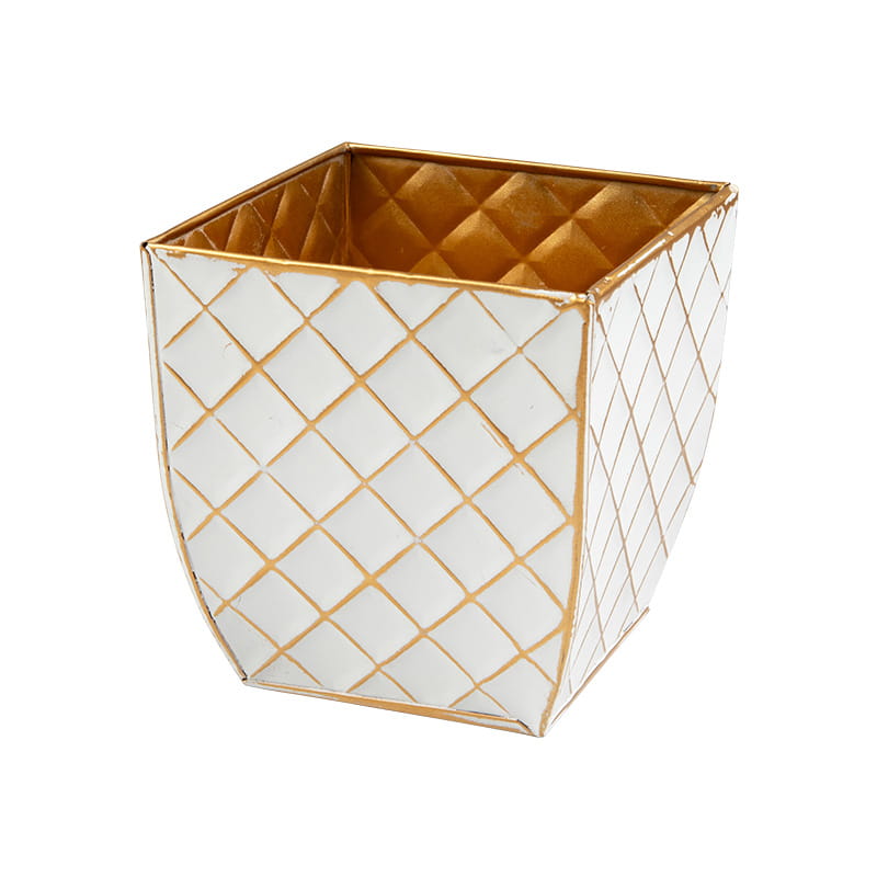 Dekoracyjna osłonka na doniczkę w kolorze złotym, połaczenie funkcjonalności i efektu. Doda wnętrzu luksusowego charakteru i podkreśli piękno każdej rośliny. Wysokość: 10 cm, średnica: 11,5 cm. Idealna do domu i biura.